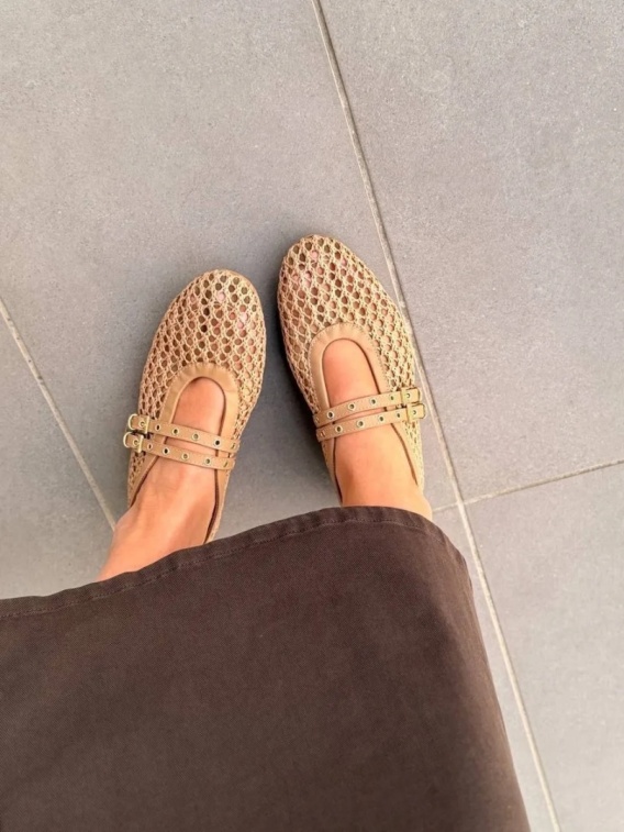 Cholewka z ażurowej siatki o wiklinowym splocie — naturalna faktura, lekka i przewiewna w letnie dni. Miękka skóra naturalna wykańcza wszystkie krawędzie, nadając butowi dopracowany wygląd.