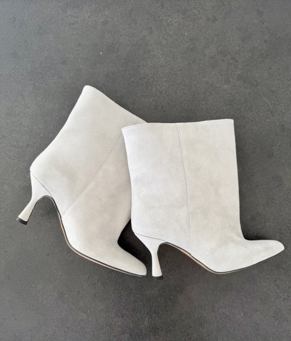 Botki L'estrosa na obcasie z miękkiej skóry zamszowej w szarym kolorze. Elegancki fason z wąską cholewką i spiczastym noskiem na 7-centymetrowym obcasie słupku.