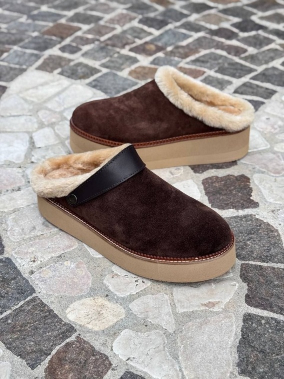 Cholewka: Skóra naturalna, zamsz Podeszwa: Wysokogatunkowe tworzywo Wkładka: Skóra naturalna Wnętrze: Futro naturalne Kolor: Brązowy Wysokosć podeszwy: z paskiem - 2,5 cm; bez paska - 4 cm