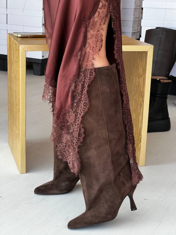 Cholewka: Skóra naturalna zamszowa Podeszwa: Wysokogatunkowe tworzywo Wkładka: Skóra naturalna Wnętrze: Skora naturalna Obcas: 6 cm Szerokość cholewki: Rozmiar 36 - 45-46 cm Rozmiar 37 - 46-48 cm Rozmiar 38 - 47-49 cm Rozmiar 39 - 48-50 cm Rozmiar 40 - 49- 51 cm