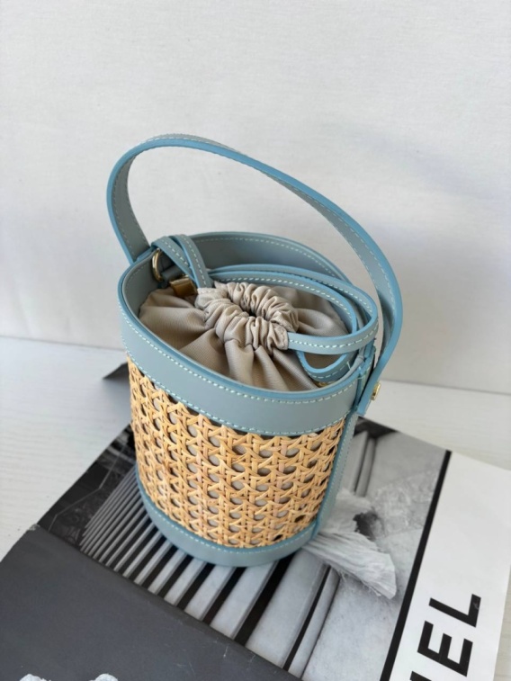 Torebka typu worek z naturalnej skóry i plecionki rattanowej. Regulowany pasek i zamknięcie ściągane sznurkiem. Połączenie klasycznego brązu z naturalnym wzorem.