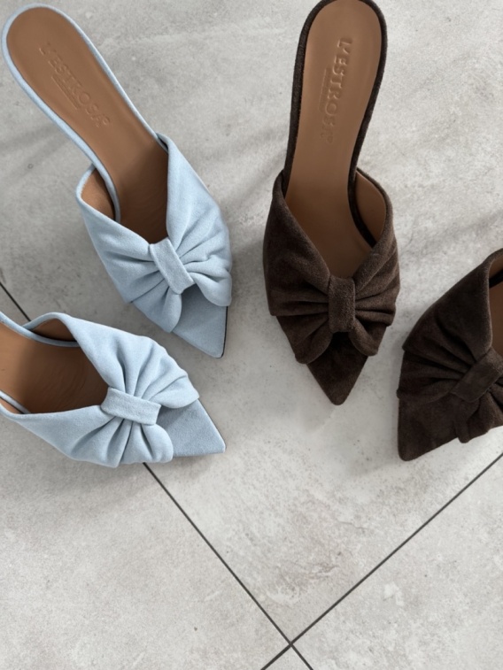 Zamszowe klapki z kokardą na szpilce 7 cm. Miękki zamsz w jasnoniebiskim i brązowym odcieniu, spiczasty nosek. Włoska skóra naturalna z wygodną skórzaną wkładką.